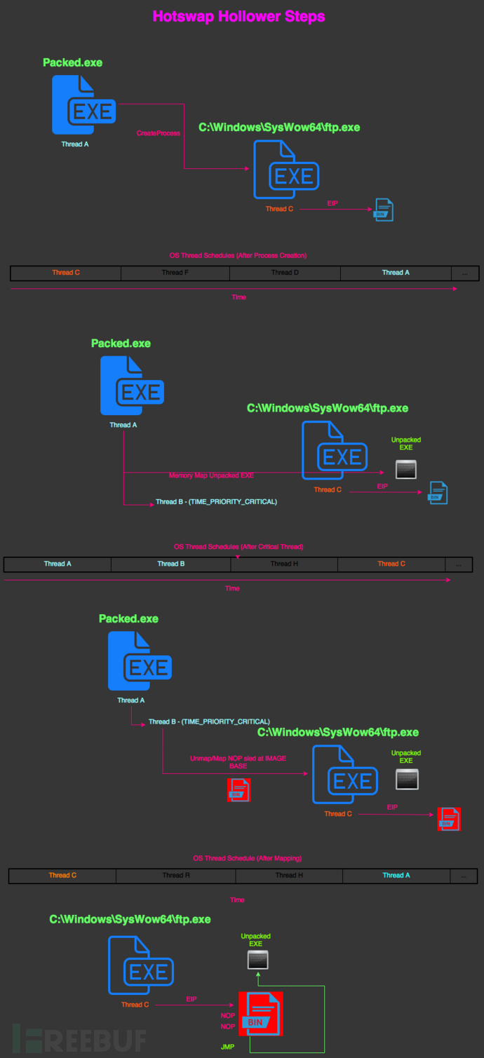 目前,絕大多數Process Hollowing技術的工作機制如下:掛起進程,寫入遠端記憶體,修改內容(SetThreadContext/CreateRemoteThread/QueueUserAPC),然後恢復進程運行。RISCyPacker技術對之前的ProcessHollowing技術進行了優化,它只需要修改記憶體內容(NtUnMapViewOfSection/NtMapViewOfSection)即可實現ProcessHollowing。
